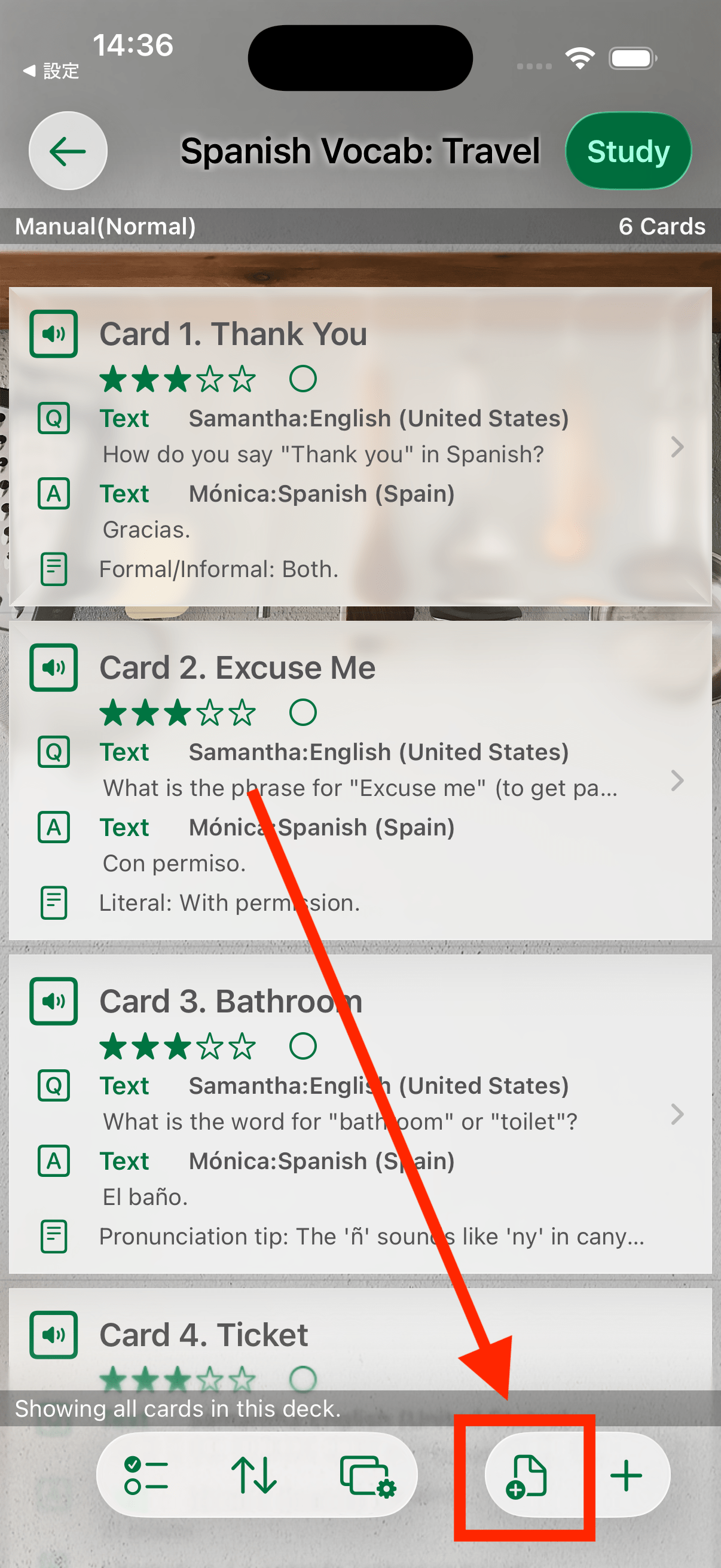 Quickly and efficiently add multiple Flashcards to your Deck. This is perfect for large vocabulary lists or pre-existing study data.