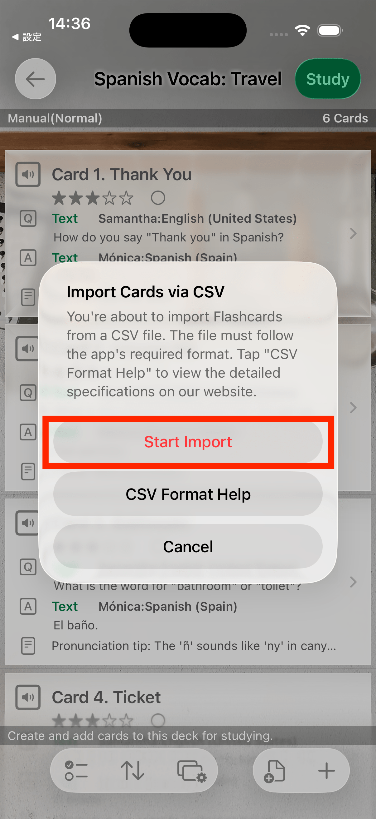 From the Flashcard List screen within your selected Deck, tap the CSV Import button.