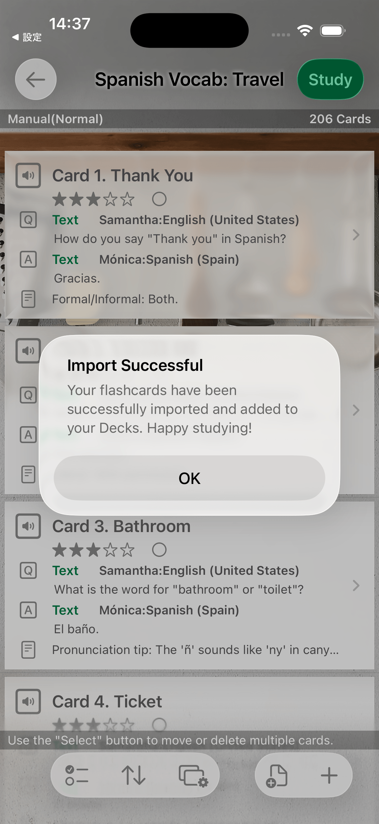 The app will process the data, create the new Flashcards, and they will appear in your selected Deck once the process is complete.