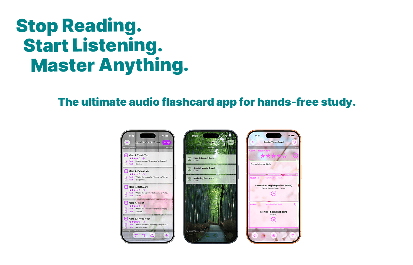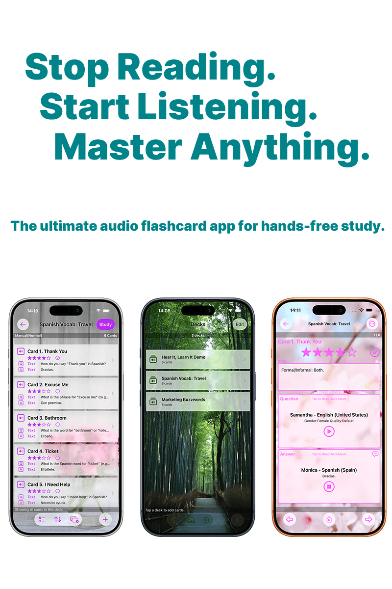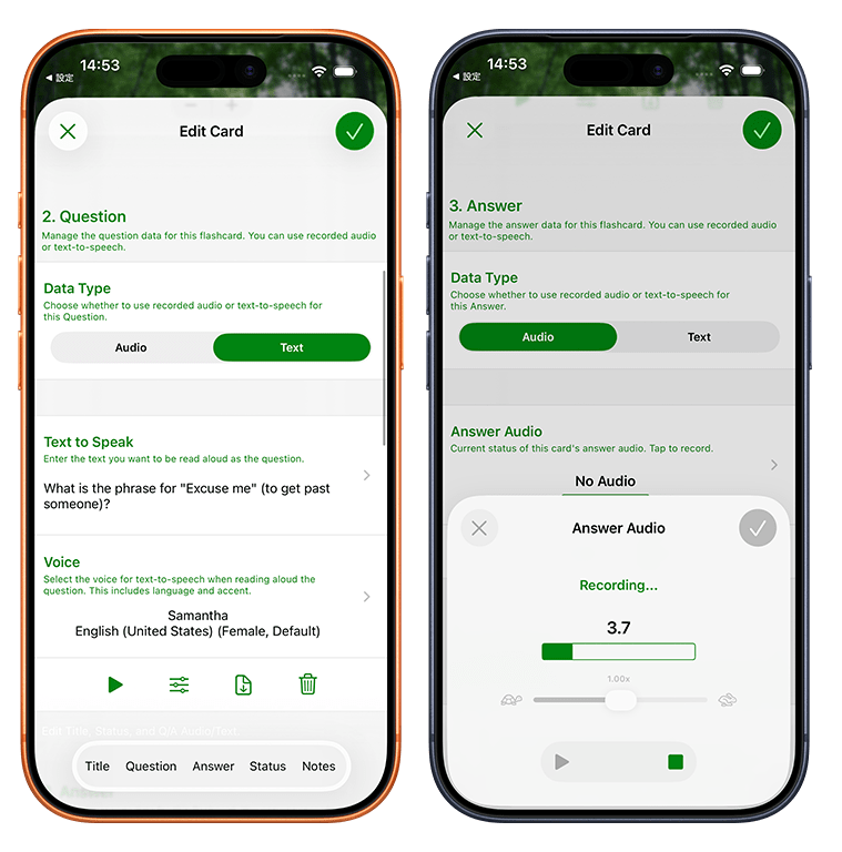 Create truly personal Flashcards. Question and Answer can use recorded audio or TTS text. Record your own voice, import a friend's motivational file, or instantly generate audio from text using our high-quality Text-to-Speech (TTS) feature.